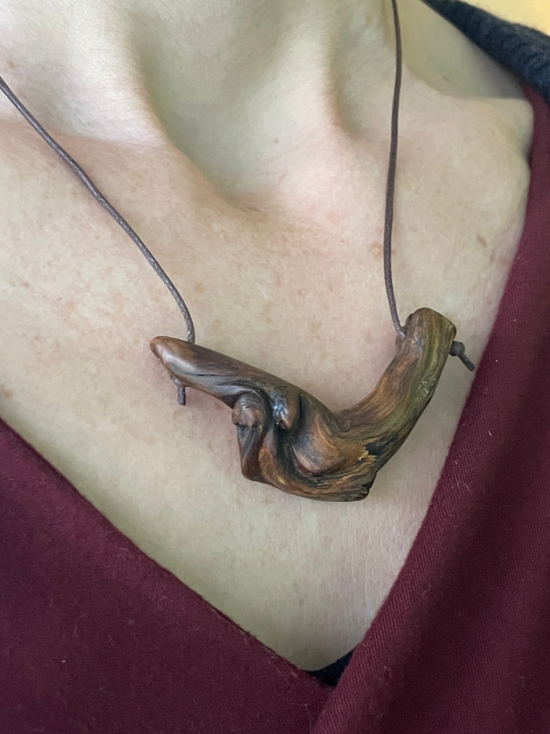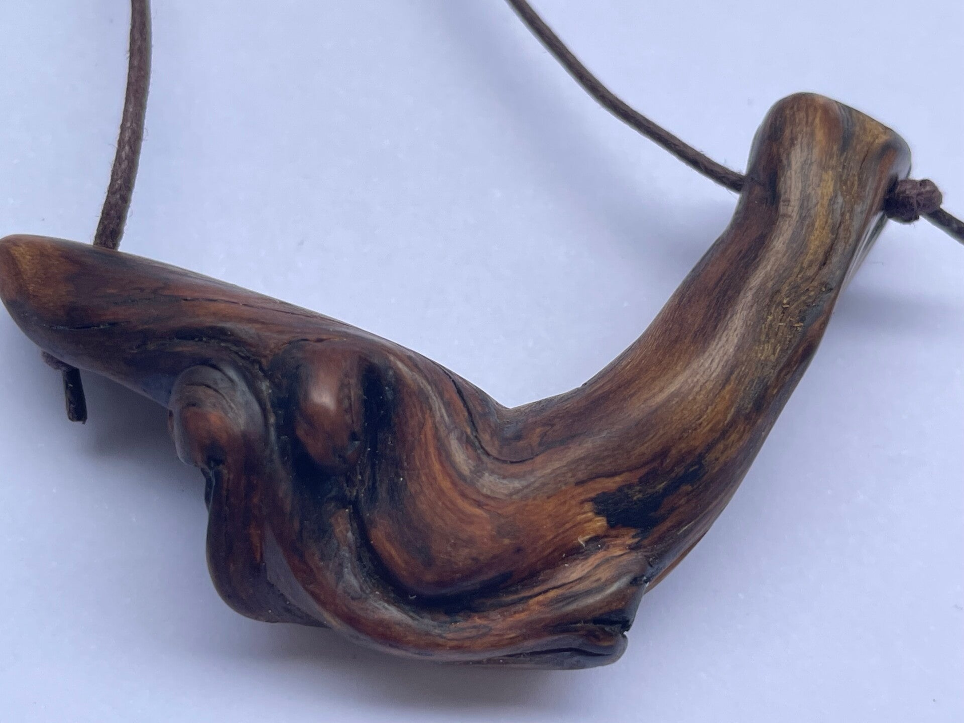 Deze hanger is tot stand gekomen door me over te geven aan het hout. Van vorm naar vorm werk ik, totdat er iets ontstaat zonder verwachting. En deze hanger met vrouwelijke zachte kracht is het resultaat. Het hout is mij onbekend, ik vind vaak stukjes hout in het bos op de grond, maar zie niet altijd van welke boom ze komt.